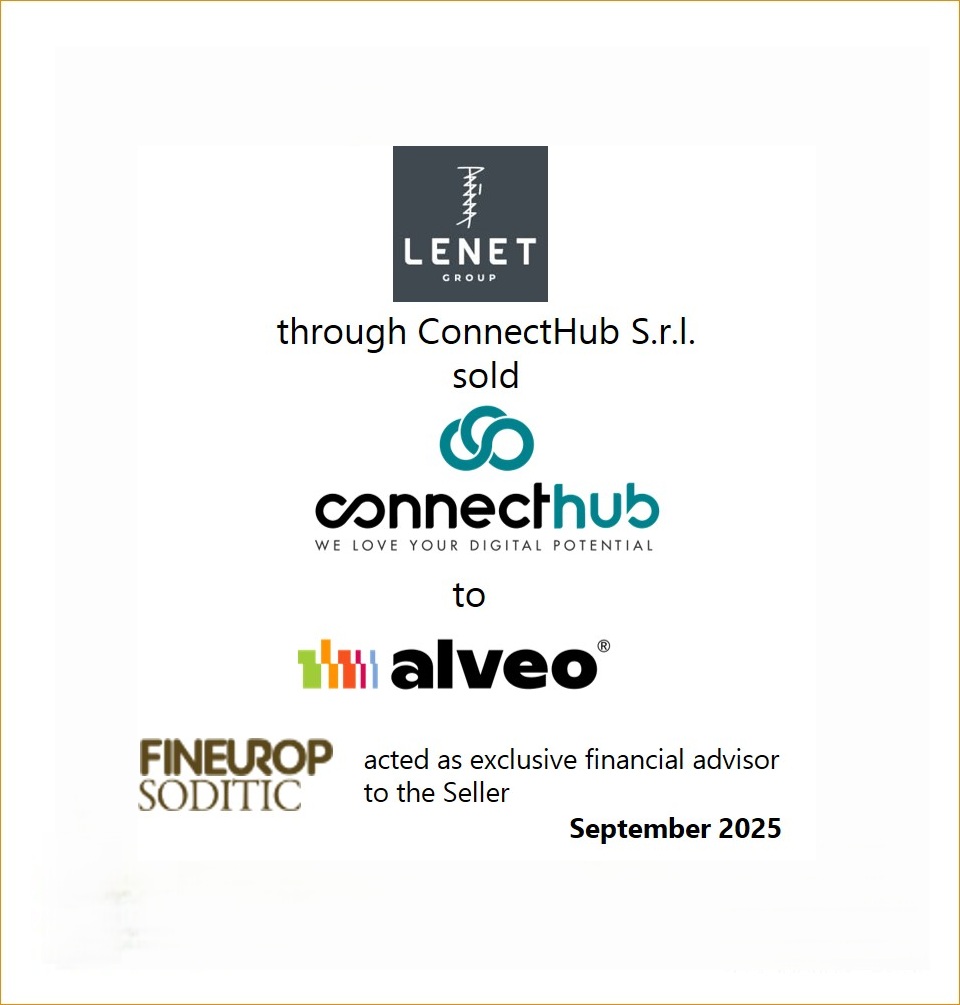 Fineurop Soditic ha agito in qualità di advisor finanziario esclusivo di Gruppo Lenet per la cessione del 100% delle quote di ConnectHub Digital S.r.l. a PA ABS, controllata da Alveo Group, partecipata dai fondi Alcedo SGR, FVS SGR, Friulia S.p.A. e Clessidra Capital Credit SGR.